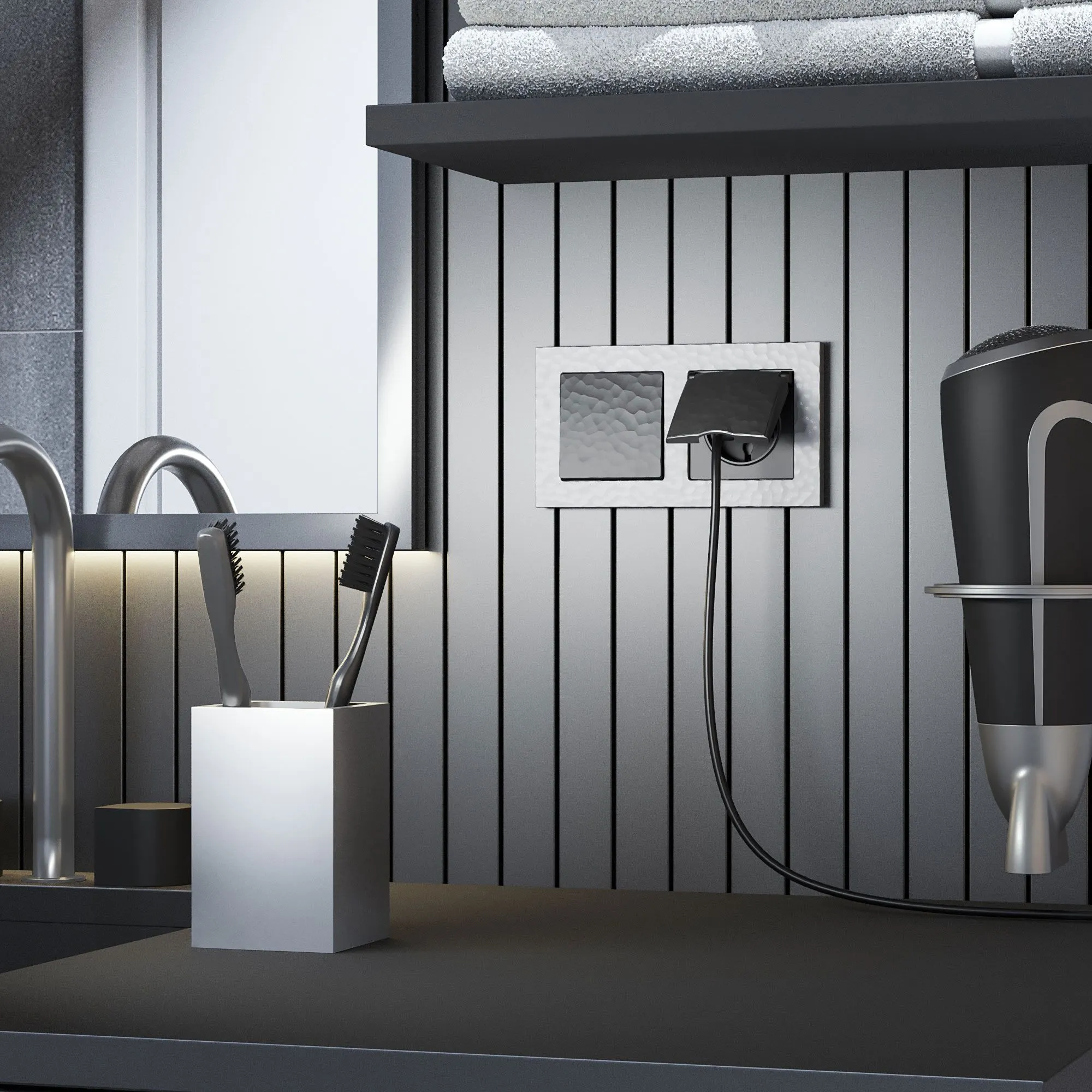 Обеспечьте максимальную безопасность в ванной, на кухне, в детской или на даче с розеткой IP44 с заземлением, защитными шторками и герметичной крышкой в элегантном рельефном дизайне. Это современное электроустановочное изделие разработано для использования в помещениях с повышенной влажностью и отвечает самым строгим требованиям безопасности.