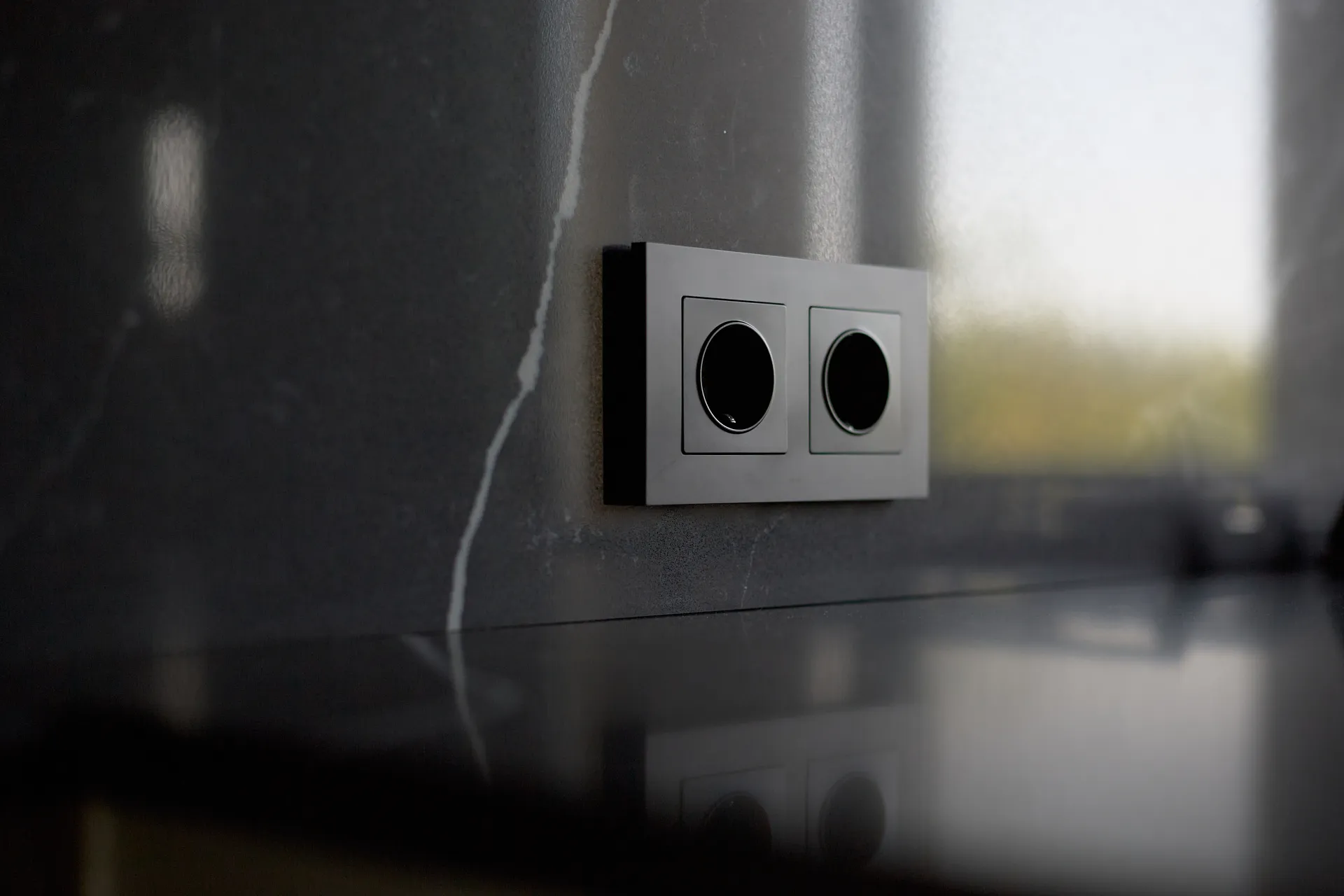 Особое внимание уделили электроустановочным изделиям. В проекте использовались розетки и выключатели Werkel, обрамленные стильными рамками Slab в черном матовом цвете. Этот выбор идеально подчеркнул современный дизайн помещения: четкость прямых линий и строгость лаконичных форм гармонируют с общим интерьером. Корпуса механизмов и рамки выполнены из негорючего поликарбоната, что обеспечивает долговечность и безопасность использования .